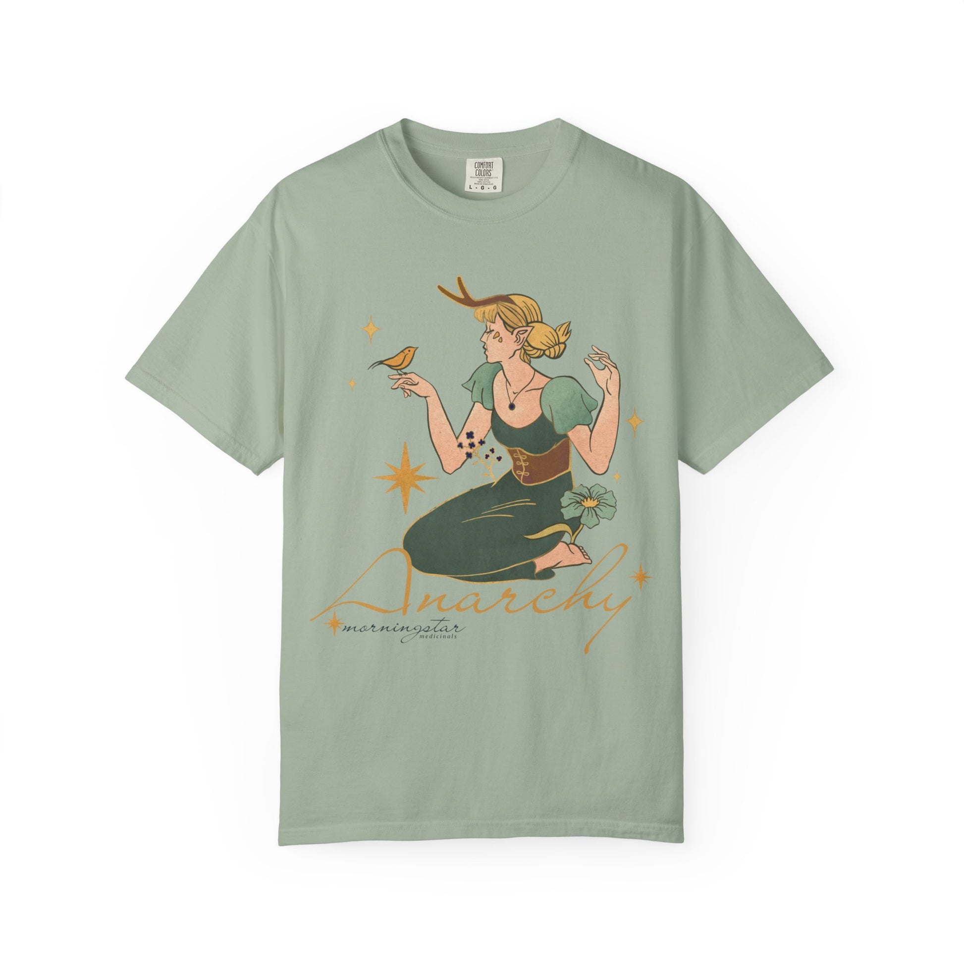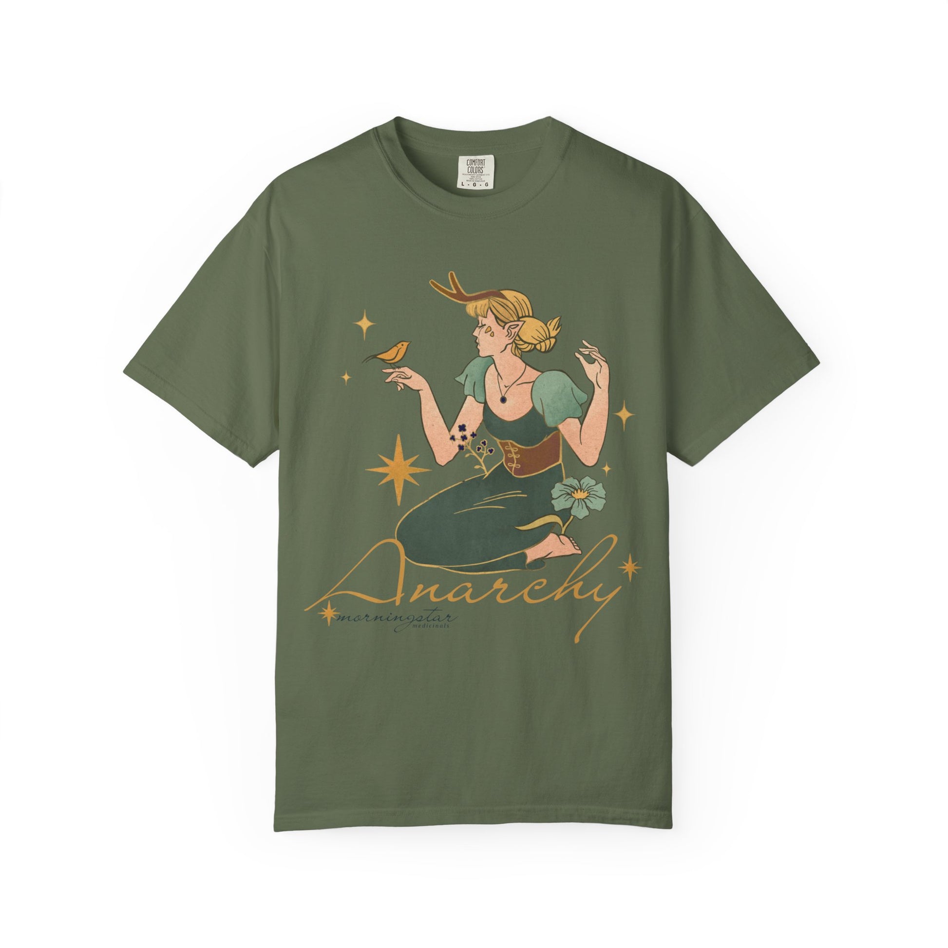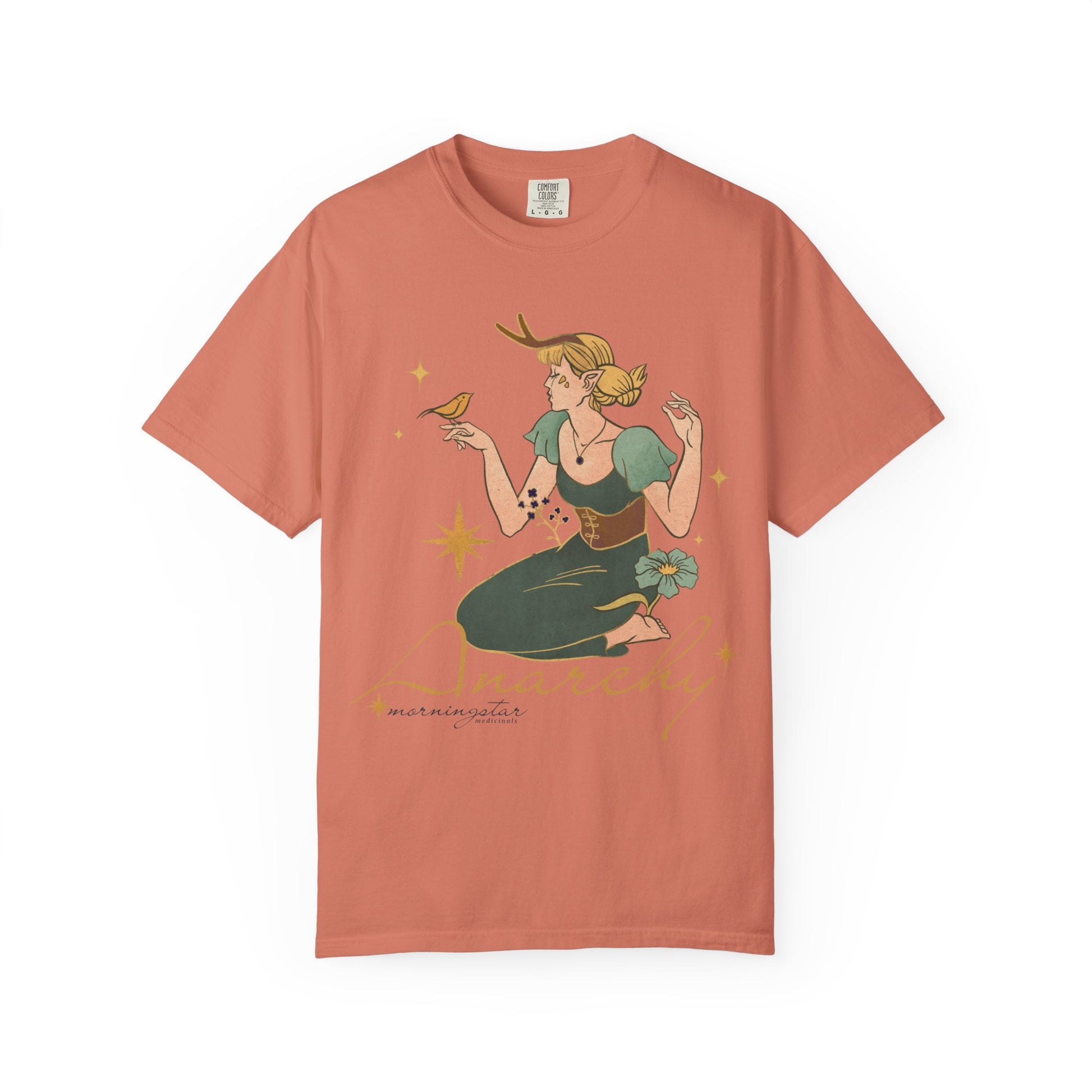 Untamed and alive. This design features a girl immersed in the embrace of nature—antlers rising from her head, flowers surrounding her, a bird perched gently on her finger. Beneath it all, the word “anarchy” reclaims its true meaning: the raw, ungoverned harmony of life outside imposed order. Printed on a cozy Comfort Colors T-shirt, it’s a celebration of wild freedom and deep belonging.