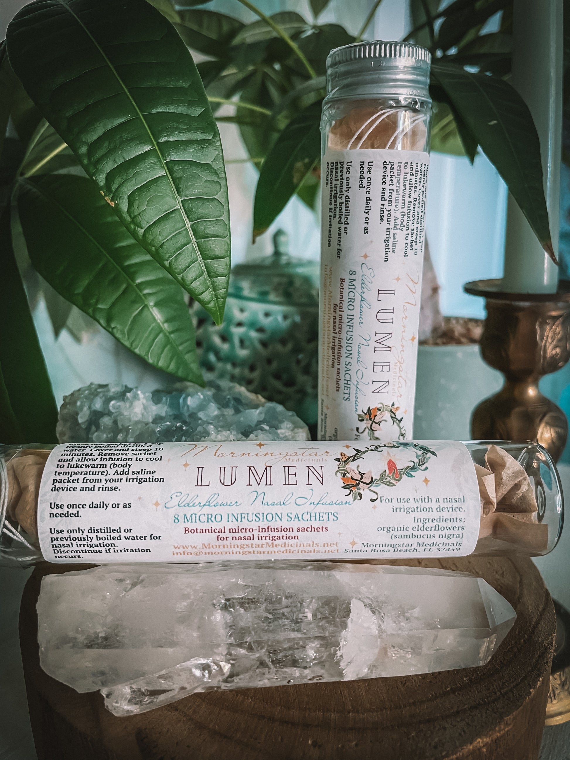 Each Lumen sachet contains a precisely measured micro-dose of elderflower designed to be infused in warm water and used with a saline nasal rinse.